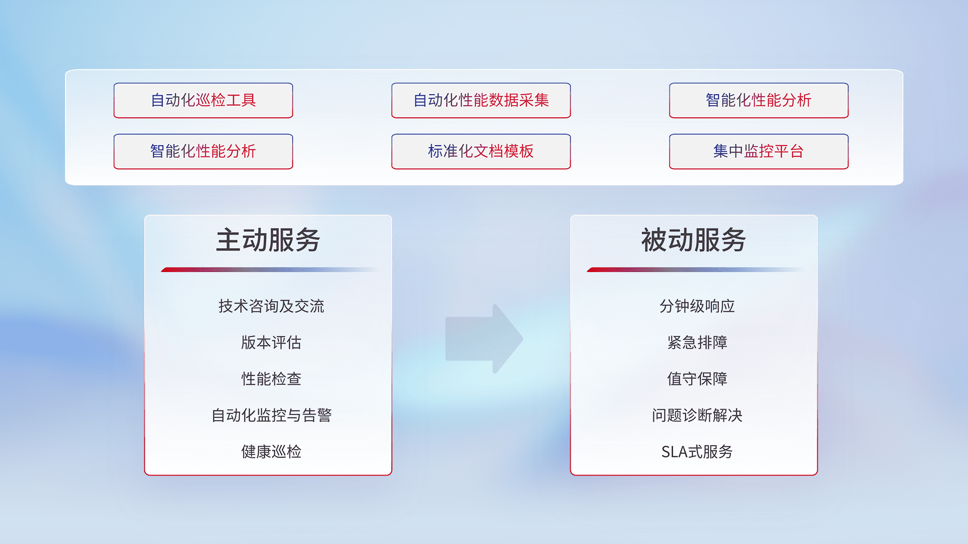 智能化工具和标准化文档,,,保障服务质量,,,提供主动服务(包含技术咨询、、、版本评估、、、性能检查、、自动化监控与告警、、、、健康巡检)和被动服务包含(分钟级响应、、、、紧急排障、、值守保障、、、、问题诊断解决、、、、SLA服务)。。。